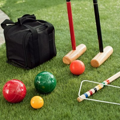 Shop for Backyard Games from BocceBallSets.com! With all the work you put in your lawn you deserve to spend more time on it... without the mower. We can think of no better way to experience the beauty and subtle details of your turf than with the Field Club Bocce and Croquet Package. This package gets you two backyard classics- bocce and croquet- in one affordable package. And these ain't your run-of-the-mill department store sets. The croquet set boasts a vintage design with mallets and goal posts crafted from durable engineered plywood sealed with beautiful hardwood veneers and finished in classic colors to match the poly-resin balls. The bocce ball set features etched red and green bocce balls and a yellow pallino all crafted from durable resin- the most popular material for bocce sets because of its heft resilience and ability to withtstand repeated use. You've walked your yard many times gotten to know intimately every undulation tree root and subtle slope. It's time to put your knowledge to use. There's a reason they call it home field advantage. Croquet Set Details: Finely-crafted with vintage design3.125-inch poly-resin balls30-inch wood mallet handles 8.5-inch shaped wood mallet headsTwo 8-inch wood goal stakes Vinyl-coated wire wickets to withstand the elementsIncludes 840-denier nylon carry/storage bag Bocce Ball Set Details: Durable resin balls in classic green and redEtched patterns allow for up to 8 players Yellow pallino for improved visibilty Ball size: 110mm Pallino size: 60mm Includes 680-denier nylon carry bag